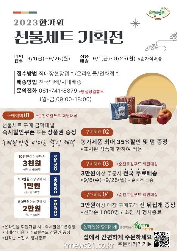 이번 추석 기획전에서는 최대 35% 할인과 덤 증정 행사가 진행되며, 순천로컬푸드 소비자 회원에게는 구매 금액대별 즉시 할인 쿠폰 및 상품권 증정 등 다양한 혜택이 주어진다. 25일까지 진행되는 사전 예약은 순천로컬푸드 온라인몰 ‘함께가게’와 유선전화, 직매장 현장 접수를 통해 가능하다.
