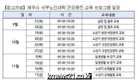 교육은 제주한라대학교 간호학과 겸임교수, 보건소 치과 공중보건의사, 영양사 및 운동지도사가 각 분야별로 맞춤형 전문 교육을 실시해 어르신들의 적극적인 참여를 이끌 예정이다.