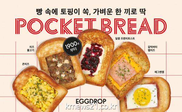 포켓 브레드는 도톰한 브리오슈 식빵 가운데 주머니(포켓)와 같은 홈을 내고 다양한 토핑을 채워 구운 메뉴로, 에그드랍이 2023년 하반기 새롭게 선보이는 신제품 라인이다. 이번에 공개하는 5종은 △콘치즈 △갈릭버터 햄 치즈 △에그 앤 잼 △달콤 프렌치 토스트 △치즈 불고기로, 모든 메뉴를 1900원~2600원의 착한 가격에 즐길 수 있다. 특히 한국인이라면 누구나 좋아할 클래식 토스트 레시피를 풍미 좋은 소스와 치즈 첨가 등으로 업그레이드해 맛의 완성도를 높였다.
