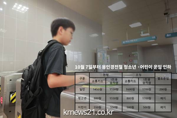 다음 달 7일 수도권 전철 기본요금이 인상되지만, 별도 요금 폐지로 용인경전철을 이용하는 청소년과 어린이에게는 요금 인하 효과가 생긴다.