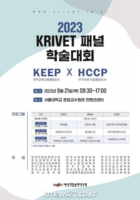 ▲ 사진=한국직업능력연구원한국직업능력연구원(원장 류장수)은 9월 21일(목) 오전 9시 30분부터 ‘2023 KRIVET 패널 학술대회’를 서울대학교 호암교수회관에서 개최한다. 이번 학술대회는 ‘제18회 한국교육고용패널(KEEP) 학술대회’와 ‘제12회 인적자본기업패널(HCCP) 학술대회’가 함께 운영된다.