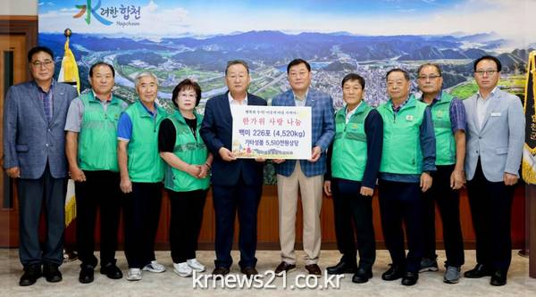 ▲ 사진=합천군새마을운동합천군지회(지회장 박진식)는 지난 20일 합천군청을 방문해 한가위 사랑나눔 일환으로 어려운 이웃을 위해 사랑의 쌀4,520kg(20kg, 226포) 전달식을 가졌다.