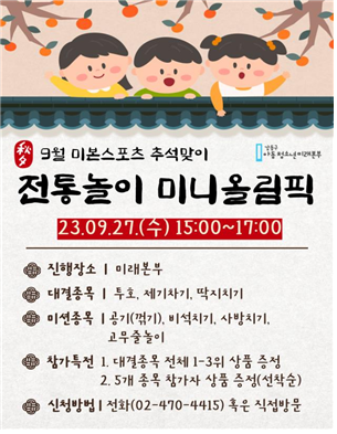 이 날 미니올림픽에는 3개의 대결종목(▲투호, ▲제기차기, ▲딱지치기)과 4개의 미션종목(▲공기(꺾기), ▲비석치기, ▲사방치기, ▲고무줄놀이) 경기가 개최된다. 강동구아동청소년미래본부는 각 종목별로 참가할 선수를 모집하고 있다.