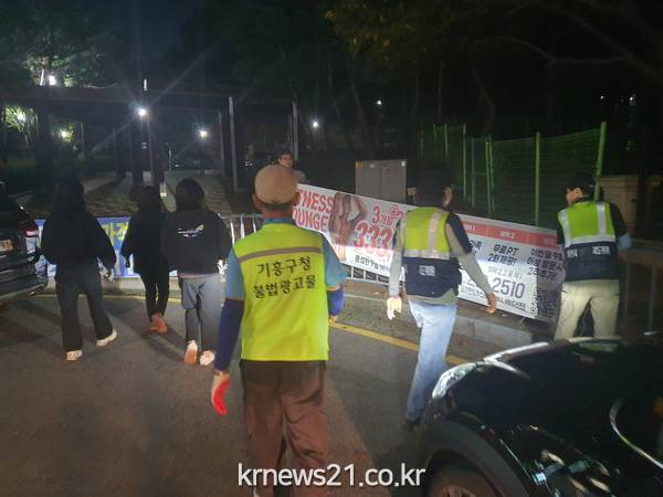 ▲ 사진=용인시용인특례시 기흥구가 하반기 늘어나고 있는 분양 현수막과 헬스장 족자, 벽보, 광고 현수막 등 불법 광고물에 대한 야간 합동단속을 진행했다고 26일 밝혔다.