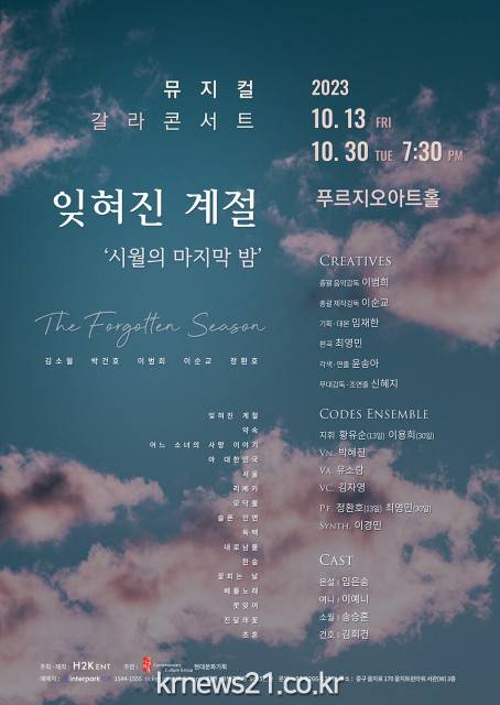 소프라노 임은송·이예니, 테너 김희건·김은교·송승훈으로 이뤄진 화려한 캐스팅도 창작 뮤지컬 잊혀진 계절 ‘시월의 마지막 밤’의 또 다른 자랑이다. 코데스 앙상블의 풍성한 라이브 반주에 성악 전공자들의 풍부한 성량으로 불려지는 잊혀진 계절은 지금까지 경험해보지 못한 새로운 환상의 세계로 관객을 초대할 것이다.