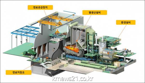 열 생산설비의 공정은 △연소로(수냉식, 자동 제어식) △보일러(1-Drum) △비촉매식 질소산화물 제거설비(SNCR) △반건식 반응탑(SDR) △건식 반응탑(DR) △여과집진기(Bag Filter) △스팀 가스가열기(SGH) △촉매식 질소산화물 제거설비(SCR) △열교환기(2nd 절탄기) △유인송풍기(ID Fan) △습식세정탑(Wet Scrubber) △백연방지 설비 △굴뚝(Stack)으로 구성돼 있다.