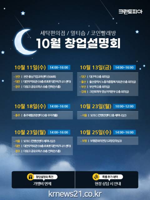 크린토피아는 예비 창업자를 위해 매달 전국에서 창업설명회를 개최하고 세탁 창업 전반에 대한 컨설팅과 다양한 혜택을 제공하고 있다. 이번 10월 창업설명회는 10월 11일 △천안 △대전 △광주를 시작으로, 10월 13일 △대구 △울산 △부산 △김해, 10월 18일 △충주, 10월 23일 △서울 △대전 △광주, 10월 25일 △보령에서 진행된다.