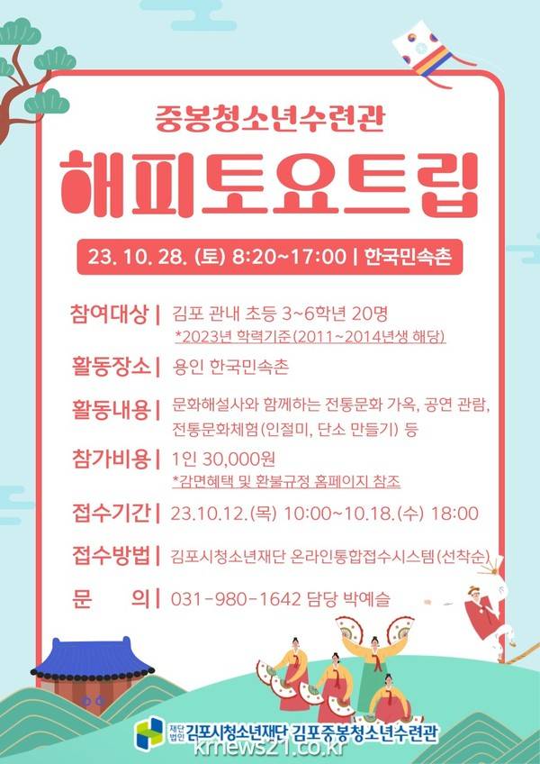 ▲ 사진=김포시(재)김포시청소년재단 김포중봉청소년수련관에서 김포 관내 초등 3~6학년(2011~2014년생) 20명을 대상으로 ‘해피토요트립 4기’를 운영한다.