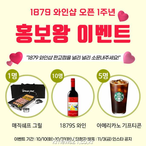 1879와인샵은 참여자 중 16명을 추첨해 매직쉐프 전기 그릴(1명), 1879S 레드 와인(10명), 스타벅스 아메리카노 기프티콘(5명) 등 다양한 경품을 제공할 예정이다. 당첨자는 11월 3일(금) 1879와인샵 공식 인스타그램에서 발표한다.
