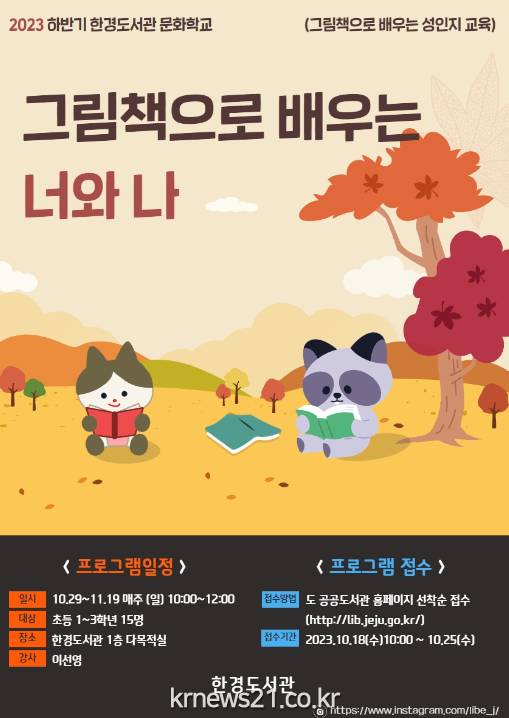 운영기간은 10월 29일(일)부터 11월 19일(일)까지 매주 일요일 오전 10시부터 2시간 동안 총 4회 한경도서관 1층 다목적실에서 운영될 예정이며, 신청 대상은 초등 저학년(1~3학년)으로 15명까지 선착순 모집한다.