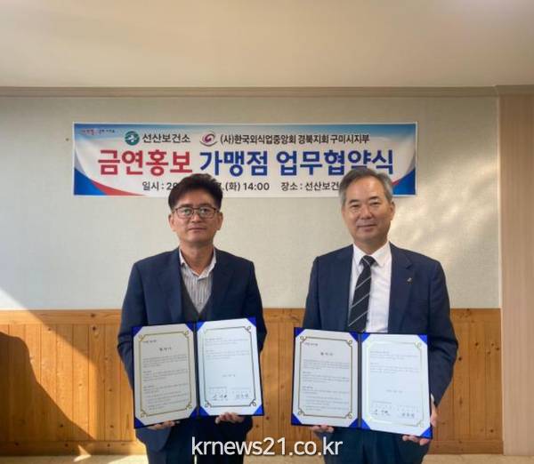 ▲ 사진=구미시선산보건소는 17일 (사)한국외식업중앙회 경북지회 구미시지부와 자율 금연 활성화를 위한 「금연 홍보 가맹점」 추진을 위해 업무협약을 체결했다.