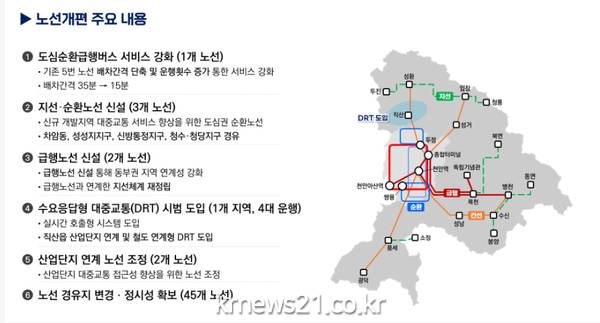 이번 개편안은 현재 운영 중인 버스노선 전체에 대한 빅데이터 분석, 운수사 협의, 시민들의 요구사항 등을 반영해 ▲도심순환 급행버스 서비스 강화 ▲지선·순환노선 신설 ▲급행노선 신설 및 수요응답형버스(DRT:천안콜버스) 시범 도입 등의 내용을 담았다.