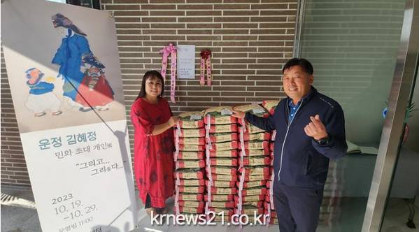 이성기 덕곡면장은 “첫 개인전을 축하드리며, 전시회 준비로도 바쁘셨을텐데 지역민들까지 생각해 주셔서 감사하다. 기탁 해주신 쌀은 덕곡면 소외계층을 위해 잘 쓰겠다”라고 말했다.