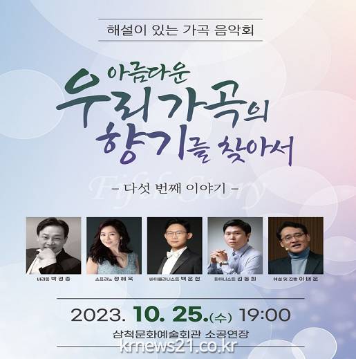 ▲ https://www.samcheok.go.kr/삼척시청삼척시가 10월 25일(수) 오후 7시 삼척문화예술회관 소공연장에서 제5회 해설이 있는 가곡 음악회를 개최한다. 해설이 있는 가곡 음악회는 ‘아름다운 우리 가곡의 향기를 찾아서’를 주제로 국내 최정상급 성악가들을 초청하여 우리나라 유명 가곡들의 탄생 배경과 사연을 재미있는 해설과 함께 즐길 수 있는 음악회이다. 이번 공연은 지난 5월, 6월, 7월, 9월에 이어 5회째 공연이며, 음악회를 통해 평소 접하기 어려운 우리 가곡들을 시민들에게 선보여 문화예술 관람 기회를 제공하고 있다. 이번 다섯 번째 음악회는 음악활동가 이태운의 해설, 진행과 함께 소프라노 정혜욱, 바리톤 박경종, 바이올리니스트 백운현, 피아니스트 김동희 등이 참여할 예정이다. 연주곡으로는 ‘내 마음’, ‘아 가을인가’, ‘달밤’, ‘그리움’, ‘옛날은 가고 없어도’, ‘아름다운 동행’ 등의 가곡들이 해설과 함께 공연되며, ‘투우사의 노래’, ‘나 가거든’, ‘시월의 어느 멋진 날에’ 등 다른 장르의 곡도 함께 선보인다. 공연 중간에는 관객과 성악가들이 다 함께 가을에 관한 노래를 불러보는 시간을 마련했고, 마지막 순서에서는 다 함께 가곡 ‘그 집 앞’, ‘바위 고개’를 부르는 시간을 가질 예정이다. 삼척시 관계자는 “감성이 풍부해지는 계절 가을에 우리 가곡들과 함께 낭만의 시간을 가져보시길 바란다.”라고 말했다.