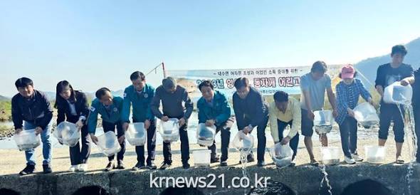 ▲ http://www.goryeong.go.kr/고령군고령군(군수 이남철)은 지난 25일 낙동강 지류인 운수면 대평리 회천일원에서 경상북도 노성환 도의원, 환동해지역본부 이경곤 해양수산국장 및 운수면 대평리 주민들이 참여한 가운데 잉어류 25,000마리와 동자개 35,000마리를 방류했다.