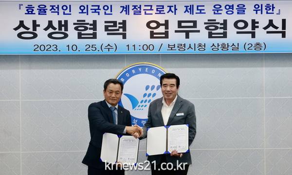 보령시는 시청 상황실에서 (사)충남보령근해안강망협회(회장 박상우)와 효율적인 외국인 계절근로자 제도 운영을 위한 상생협력 업무협약(MOU)을 체결했다.