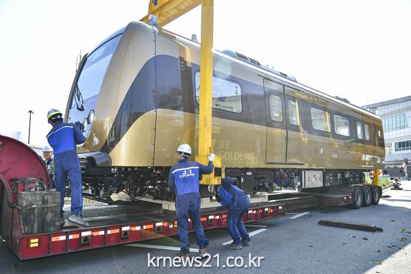 김포골드라인 전동차 증차 중 첫 번째 편성이 27일 김포한강차량기지에 반입되면서 골드라인 혼잡률 개선을 위한 증차가 순조롭게 진행 중이다. 첫 투입에 이어 2편성과 3편성은 오는 11월, 4편성과 5편성은 12월에 반입 예정이다. 김포시는 김포골드라인의 혼잡률 개선에 박차를 가하기 위해 일괄 투입에서 순차 투입으로 변경하고 국토부 및 제작사와의 협의로 당초 계획보다 6개월가량 사업기간을 단축했다.