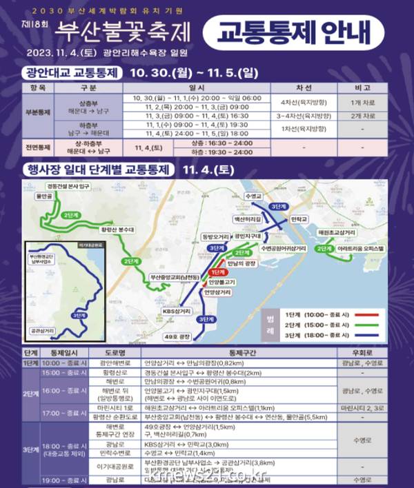 글로벌 관광도시로서의 면모를 보여줄 「제18회 부산불꽃축제」가 4일 앞으로 다가왔다. 부산시(시장 박형준)는 2030부산세계박람회 유치 결정을 앞두고 오는 11월 4일 개최되는 부산불꽃축제에 관람객의 안전을 최우선으로 두고 행사장 안전관리에 총력을 다하고 있다고 밝혔다. 먼저 시는 안전관리계획 수립과 안전 심의를 통해 사전점검을 철저히 하고, 유관기관과 합심해 안전관리에 만전을 기하고 있다. 시는 단 한 건의 사고 없는 안전한 축제 개최를 위해 우선 총 43곳을 중점 관리구역으로 지정해 촘촘한 안전관리에 들어간다. 광안리해수욕장 8개 구역, 도시철도 6개 역사, 외부관람지역 9곳, 행사장 주 진입로 16곳, 기타지역 4곳 등 수영구, 남구, 해운대구 전역을 대상으로 한다. 또한, 100만 명 이상의 인파가 몰릴 것을 예상해 시·구 공무원과 소방, 경찰, 유관기관, 사설경호, 자원봉사자 등 6천7백여 명의 안전관리요원이 배치된다.