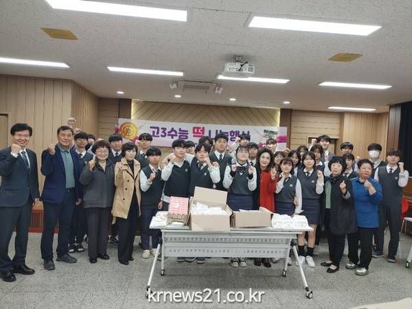 ▲ 사진=사)한국여성농업경영인 여주시연합회사)한국여성농업경영인 여주시연합회(회장 최형주)는 11월 6일(월) 대신고등학교에서 올해 수학능력시험을 치르는 고3 수험생들 격려를 위한 수능떡 나눔의 귀한 시간을 가졌다.