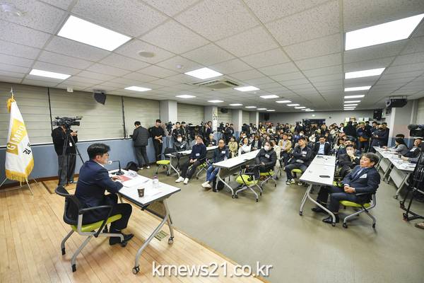 민선8기 김포시가 주요 현안에 대한 시민 소통의 일환으로 추진한 ‘테마가 있는 소통광장 시민의 의견을 듣겠습니다’ 첫 자리가 지난 7일 장기본동 행정복지센터에서 열렸다. 이날 간담회에서는 해당지역 입주자 대표를 포함한 주민 100여명이 참여해 밀도있는 소통이 이뤄졌다. 김병수 시장은 두 시간에 걸쳐 직접 설명과 질의응답으로 소통에 나섰고, 시민들 사이에서 박수가 터지기도 했다.