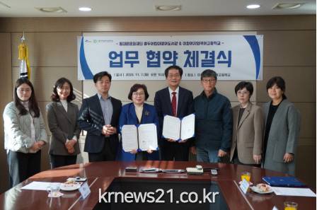 ▲ 사진=동대문문화재단동대문문화재단(이사장 이필형)에서 운영하는 용두어린이영어도서관이 지난 7일 오전 10시 이화여자외국어고등학교(교장 심충구, 서울 중구 소재)와 ‘지역의 글로벌 인재 육성 및 지역 교육 발전을 위한 업무협약’을 체결했다.