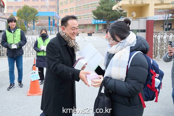 이날 여주시청 이충우 시장은 수능 제13시험장 세종중학교를 찾아 수험생들에게