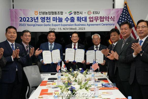 시 관계자에 따르면 이번 협약은 신녕농협과 영천시, ESU간의 3개 기관이 체결하였으며, 신녕농협은 품질 및 규격에 적합한 마늘을 안정적으로 공급될 수 있도록 협력하며, 영천시는 수출 확대를 위해 수출장려금, 국외판촉행사, 수출단지조성 등에 협력하기로 했으며, ESU는 미주지역 유통채널을 활용하여 영천시 농특산물의 수출 확대에 적극 협력하기로 서명했다고 전했다.