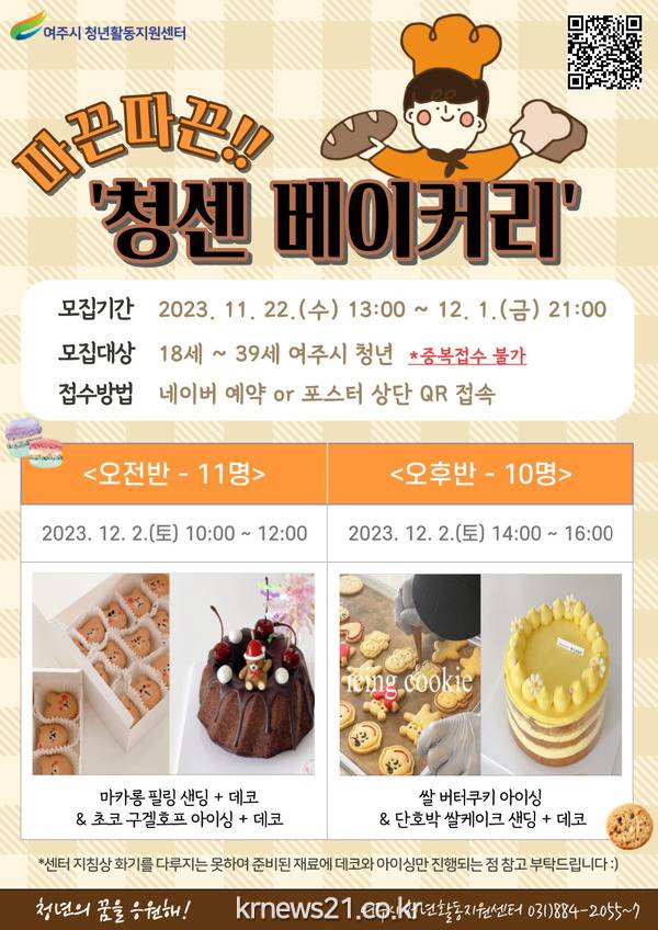 ‘따끈따끈! 청센 베이커리’ 프로그램에 대한 자세한 사항은 여주시 청년활동지원센터 홈페이지(https://yjyouthcenter.modoo.at/)를 통해 확인할 수 있다.