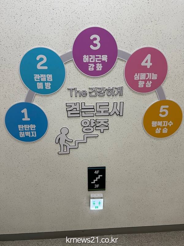 양주시 보건소는 경기섬유종합지원센터에 친화적인 건강환경을 조성하고 엘리베이터보다 계단 이용을 독려하고자 ‘워킹365 더 건강하게 걷는 계단’을 만들었다고 23일 밝혔다.