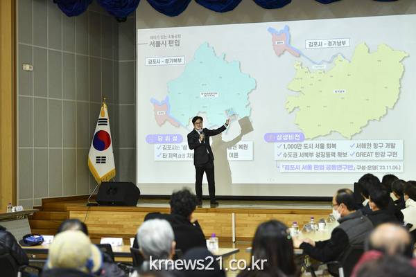 이어 그는 김포 서울편입이 이뤄졌을 때 서울이 세계적 해양도시로 진출할 수 있고, 김포 역시 변방이 아닌 해양도시 서울의 중심으로 도약할 수 있다고 강조했다.