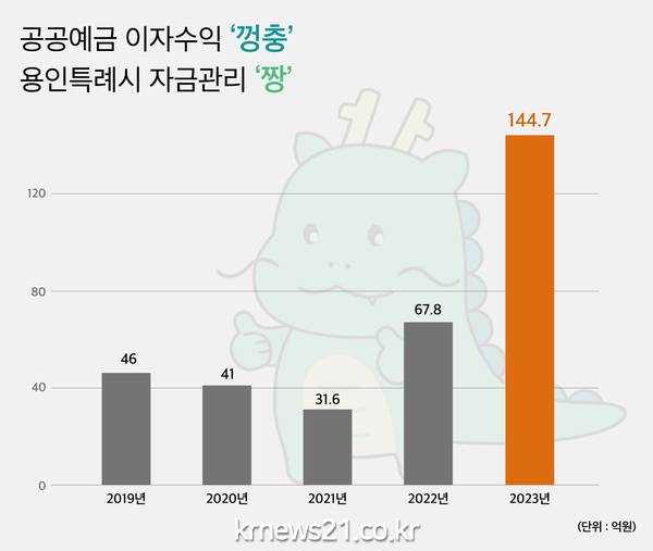 용인특례시는 2023년 공공예금 이자수입이 지난해 연간 이자수입인 68억원 보다도 112% 증가한 145억원에 달한다고 28일 밝혔다.