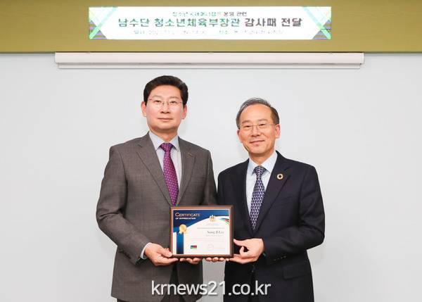 ▲ 사진=용인시청이상일 용인특례시장이 지난 27일 남수단 청소년체육부 장관에게 ‘희망나눔 운동화’ 기부에 대한 공로를 인정받아 감사패를 받았다.