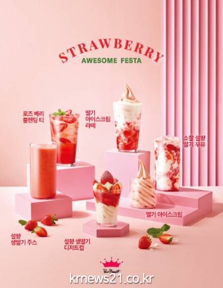 설향 딸기를 활용한 음료와 아이스크림 6종을 2회로 나눠 순차적으로 출시한다. 11월 30일에는 딸기의 달콤함을 담은 ‘딸기 아이스크림’, 설향 딸기청과 밀크 아이스크림의 바디에 딸기 아이스크림을 토핑한 ‘딸기 아이스크림 라떼’, 소화가 잘되는 우유에 딸기청을 더한 ‘소잘 딸기 설향 우유’, 장미, 히비스커스, 딸기의 조화를 느낄 수 있는 ‘로즈 베리 블렌딩티’ 등 딸기 시리즈 4종을 출시한다.