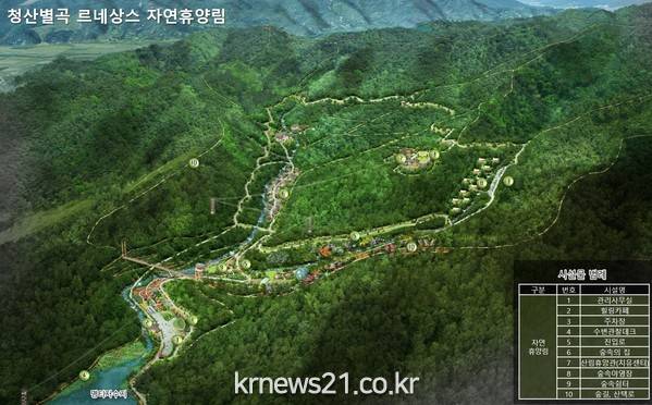 옥천군에서는 청산별곡 르네상스 자연휴양림(88억원)과 함께 치유의 숲(50억원)과 지방정원(60억원)도 단계별로 추진하여 155ha 규모의 중부권 대표 산림생태 휴양문화단지를 조성할 계획이다.