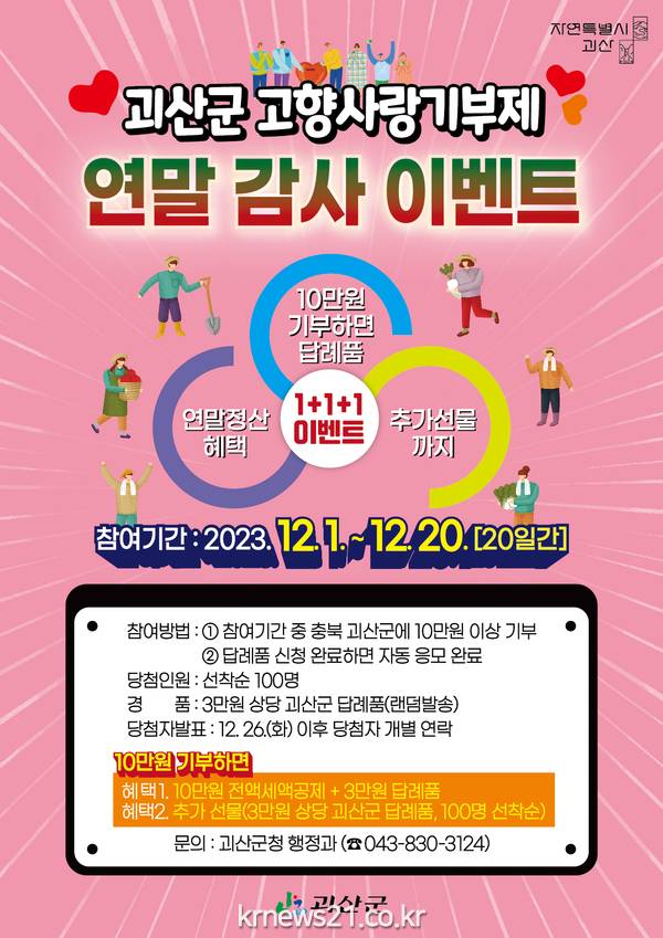 ▲ 사진=충청북도 괴산군충북 괴산군(군수 송인헌)은 오는 20일까지 고향사랑기부제 연말 감사 이벤트를 진행한다고 밝혔다.