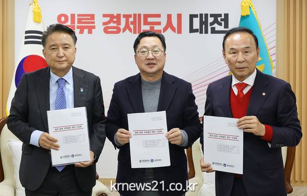 ▲ 사진=대전광역시이장우 대전시장과 김영환 충북지사, 박덕흠 국회의원은 11일 대전시청에서 만나 대전~옥천 광역철도 노선을 충북 영동까지 연장하는 것에 공감하고, 국가철도 5차 계획 반영에 공동 노력하기로 뜻을 모았다.