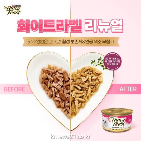 이번 팬시피스트 화이트라벨 라인 리뉴얼은 전 세계적으로 반려동물 시장이 크게 성장하면서 반려동물의 건강에 대한 관심도 높아진 가운데, 많은 반려묘 보호자가 인공색소 및 합성 보존제가 포함되지 않은 고양이 사료를 선호한다는 점 등을 고려해 진행됐다. 이전 레시피에서 사용된 인공색소는 FDA에서 반려동물 사료에 사용하도록 승인된 바 있으나, 이번 리뉴얼을 통해 반려묘 보호자들이 더더욱 안심하고 제품을 급여할 수 있게 됐다.