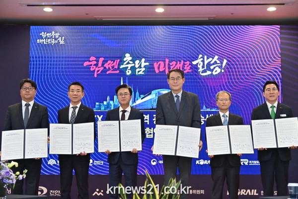 김태흠 지사는 13일 천안아산상생협력센터에서 강희업 대도시권광역교통위원회 위원장, 한문희 한국철도공사 사장, 김한영 국가철도공단 이사장, 신동헌 천안시부시장, 박경귀 아산시장 등과 ‘고속철도(KTX) 천안아산역 광역복합환승센터 지속가능한 구축 모델 마련을 위한 업무협약’을 체결했다.