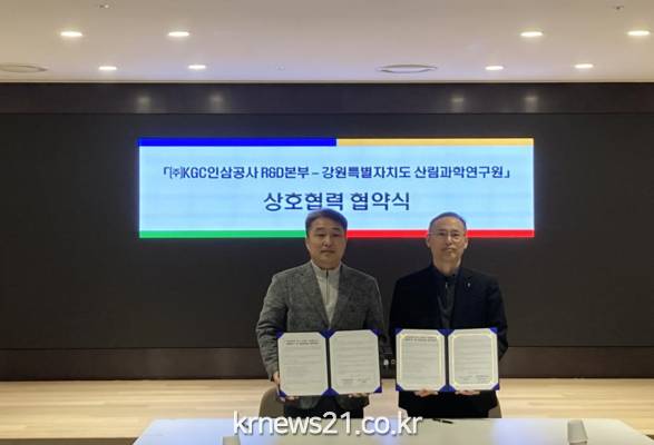 ▲ 사진=강원특별자치도강원특별자치도 산림과학연구원(원장 채병문)은 13일(수) KGC인삼공사 연구개발(R&D)본부(본부장 박만수)와 과천지식정보타운에 위치한 KGC인삼공사 과천 연구개발(R&D)센터에서 “산림생명자원 기능성 소재개발·산업화를 위한 공동연구 및 원료공급”을 위한 업무협약(MOU)을 체결하였다.