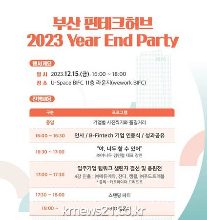 이번 행사는 부산 핀테크 허브 내 입주한 스타트업 기업의 성장을 격려하기 위한 자리로, ▲기업 성과공유 ▲「B-Fintech 20」 기업 인증식 ▲(주)야나두 김민철 대표의 강연 ▲입주기업 팀워크 챌린지 및 네트워킹 등으로 진행될 예정이다.