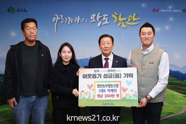 함안군은 함안농부협동조합(대표 박재민)에서 지난 4일 어려운 이웃의 따뜻한 겨울나기를 위한 성금 200만 원을 기탁했다고 밝혔다.