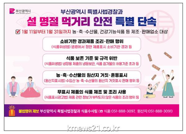 부산시(시장 박형준) 특별사법경찰과(이하 특사경)는 설 명절을 앞둔 1월 11일부터 31일까지 제수․선물용 농식품 원산지 둔갑 행위 등 불법 유통행위에 대한 '설 명절 먹거리 안전 특별단속'을 한다고 밝혔다.