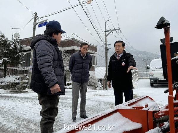 현장에서 직접 적설량, 결빙 상태를 살피고 제설작업을 총괄 지휘했으며 마을 주민들을 만나 겨울철 불편 사항도 청취해 그 자리에서 대책 마련을 지시했다.