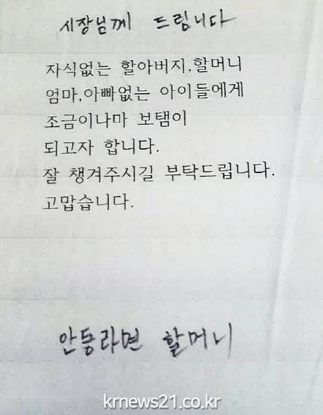 자신을 ‘안동 라면할머니’라고 밝힌 편지에는 “시장님께 드립니다.자식 없는 할아버지 할머니, 엄마 아빠 없는 아이들에게 조금이나마 보탬이 되고자 합니다. 잘 챙겨주시길 부탁드립니다. 고맙습니다. 안동 라면할머니”라고 적혀 있어 추운 겨울 따뜻한 감동과 보는 이들의 눈시울을 붉히게 한다.