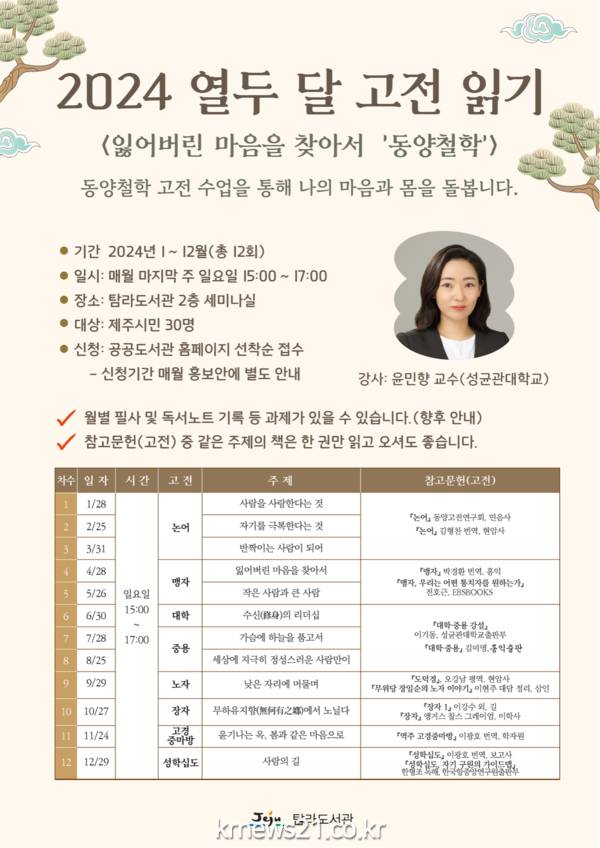 탐라도서관은 2024년 한 해 동안 <</span>잃어버린 마음을 찾아서 ‘동양철학‘>을 주제로 ‘열두 달 고전 읽기’ 프로그램을 운영한다.