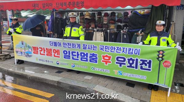 이날 교통봉사대는 신호위반, 안전거리 미확보, 중앙선 침범 등 안전운전 의무 소홀로 교통사고가 자주 발생한다는 점을 강조하며, 운행 차량과 시민들을 대상으로 ‘멈추고, 살피고, 확인하고, 건너가요!’, ‘빨간불엔 일단멈춤 후 우회전’과 같은 구호를 외치면서 운전 중 휴대전화 사용하지 않기, 안전띠 착용하기, 정지선 지키기, 신호 지키기 등 꼭 지켜야 할 안전 수칙들을 안내했다.
