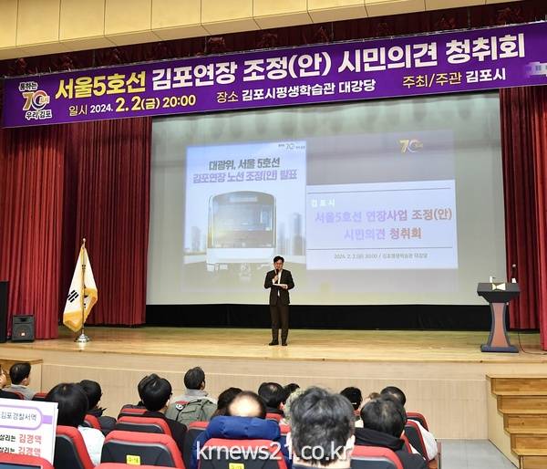 김포시가 2일 ‘서울5호선 연장사업 노선 조정(안)에 대한 시민의견 청취회’를 열고 김포시민의 의견을 청취했다. 2일 오후 8시부터 김포시 평생학습관 대강당에서 열린 서울5호선 김포연장 시민의견 청취회에서 다수의 시민들은 “빠른 사업 추진이 우선이고, 경제성이 가장 높은 노선안 추진이 바람직하다”는 의견을 내보였다.