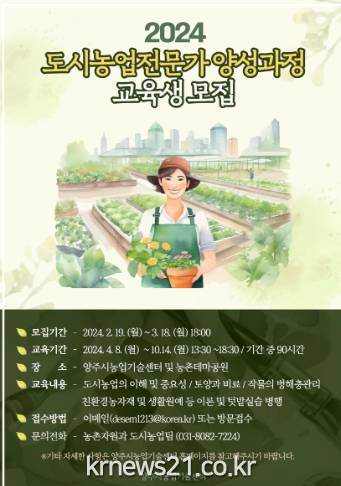 ▲ 사진=양주시청양주시는 내달 18일까지 도시농업 활성화를 이끌 도시농업 선도 전문인력 양성을 위한 ‘도시농업전문가 양성과정’에 참여할 교육생을 모집한다고 19일 밝혔다.