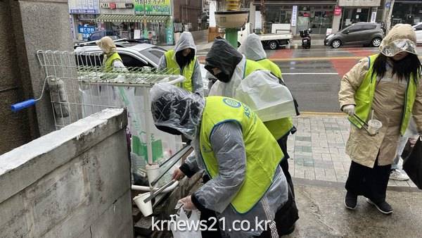21일, 전날부터 꾸준히 내리고 있는 가랑비에 아랑곳하지 않고 환한 모습의 학생들이 연둣빛 조끼를 맞춰 입고 공원 입구에 모여들었다. 장갑 낀 손에 집게와 쓰레기봉투를 든 학생들은 삼삼오오 짝을 이뤄 공원 곳곳으로 흩어져 정화활동을 펼쳤다. 학생들은 새 학기 개학 전에 이번 봉사활동을 미리 계획해왔기 때문에 비가 오는 다소 궂은 날씨였으나 밝은 미소로 정화활동에 적극 임했다. 공원 내 화단은 물론 산책로와 연수역 주변 상가밀집 지역까지 곳곳을 살피며 아무렇게나 버려진 각종 쓰레기들을 말끔히 치웠다. 담배꽁초, 과자봉지, 음식물 포장재, 생수병, 캔 등 다양한 생활쓰레기들이 50리터 종량제봉투 16개를 가득 채웠다.
