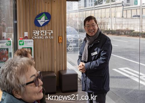 ▲ 사진=광진구청김경호 광진구청장은 27일, 주민들이 쾌적하고 편안한 환경에서 쉴 수 있도록 마련한 ‘스마트 휴 쉼터’ 살피기에 나섰다.